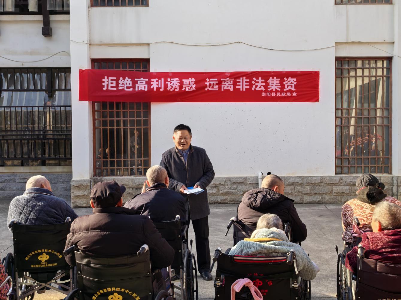 12月3日,县民政局分别在县社会福利院、颐和养老服务中心等地,开展防范非法集资宣传,通过张贴宣传横幅、发放宣传手册、现场答疑解惑等方式,向老年人普及非法集资相关知识。重点围绕非法集资的常见表现形式等内容展开讲解,结合崇阳本地典型案例,生动揭示非法集资的欺骗性和危害性,提醒老年人切勿轻信“高收益、无风险”等虚假承诺。