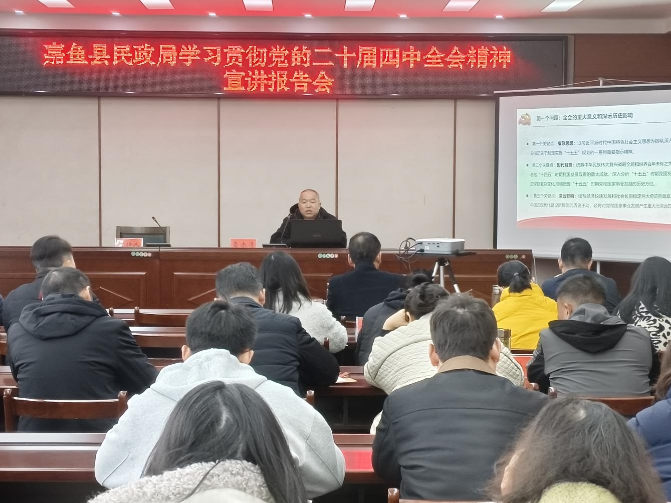 12月11日,县民政局召开二十届四中全会精神宣讲报告会。邀请县委党校副校长雷赤清作专题辅导。全县民政系统干部职工参加学习。